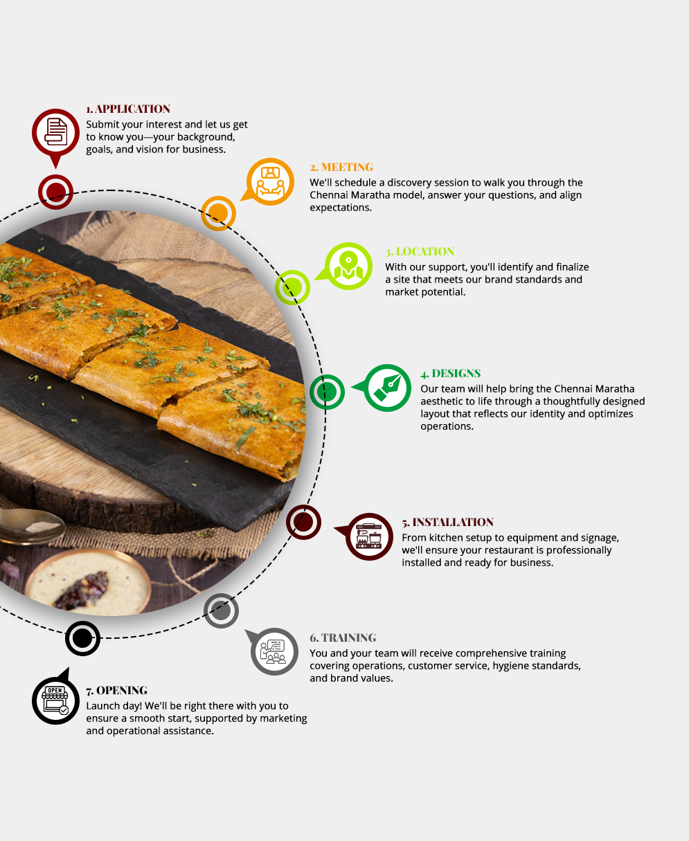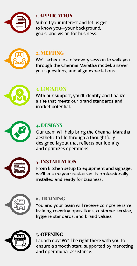 Becoming a franchisee means stepping into business with the backing of a trusted and growing brand. By partnering with Chennai Maratha, you’re not just opening a restaurant—you’re joining a vibrant, community-driven network that thrives on authentic flavors and operational excellence. As a franchise partner, you gain access to a proven business model, streamlined systems, curated menus, hands-on training, and ongoing support from the Chennai Maratha team. In return for a fixed franchise commitment, you benefit from the credibility, consistency, and recognition that comes with being part of a brand built for long-term success.